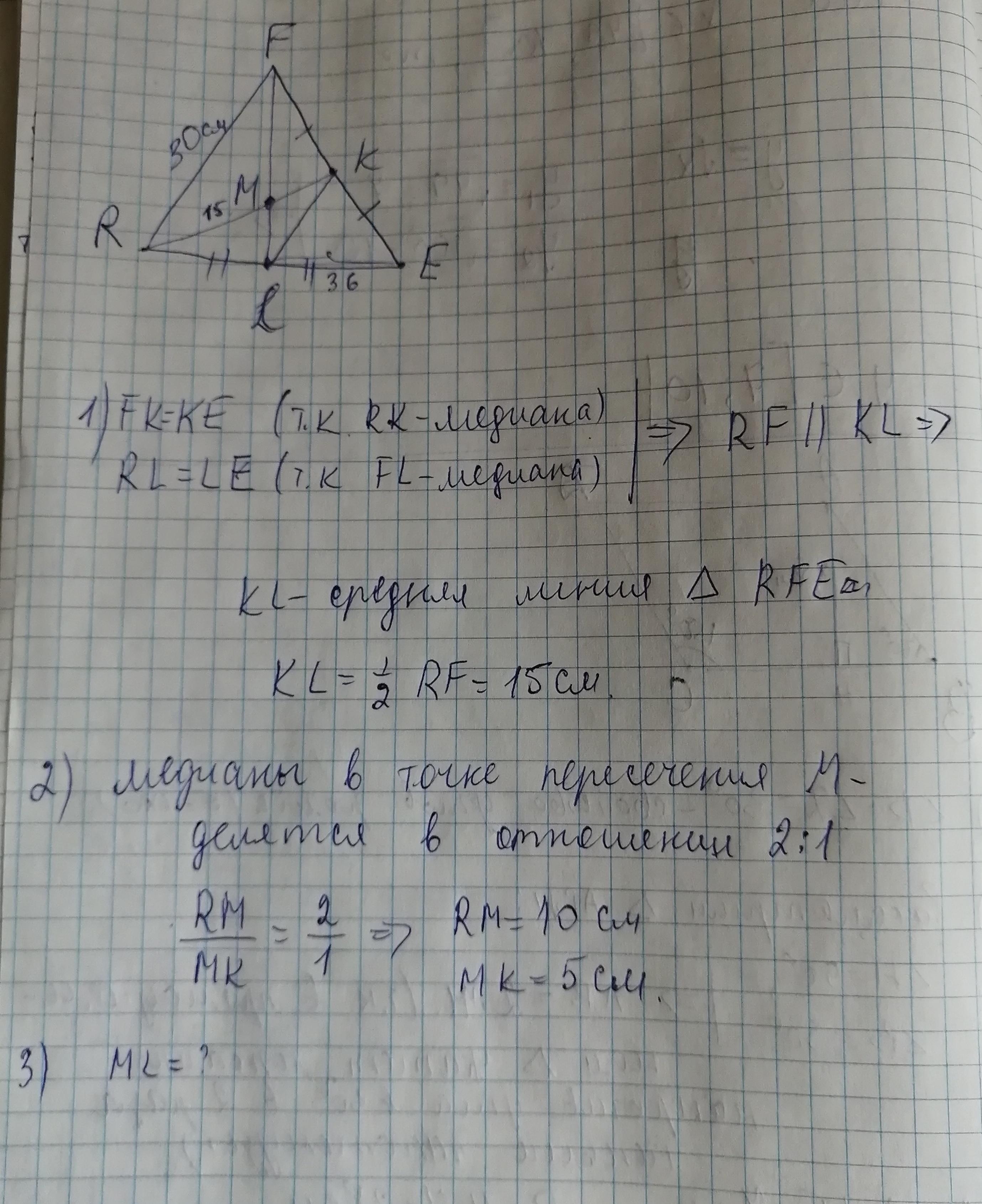 В треугольнике RFF,проведены медианы RK и FL и пересекаются в т.М,RF=30 см. RK=15см,EL-36см. Найди периметр треугольника KML. Помогите