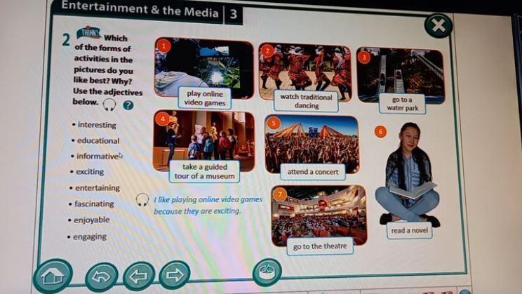 Which of the forms of activities in the pictures do you like best? Why? Use the adjectives below. • interesting • educational informative • exciting • entertaining • fascinating · enjoyable • engaging ДАМ 20 БАЛЛОВ СРОЧНОООО!!!!!!!!!!!!!!!!!!!