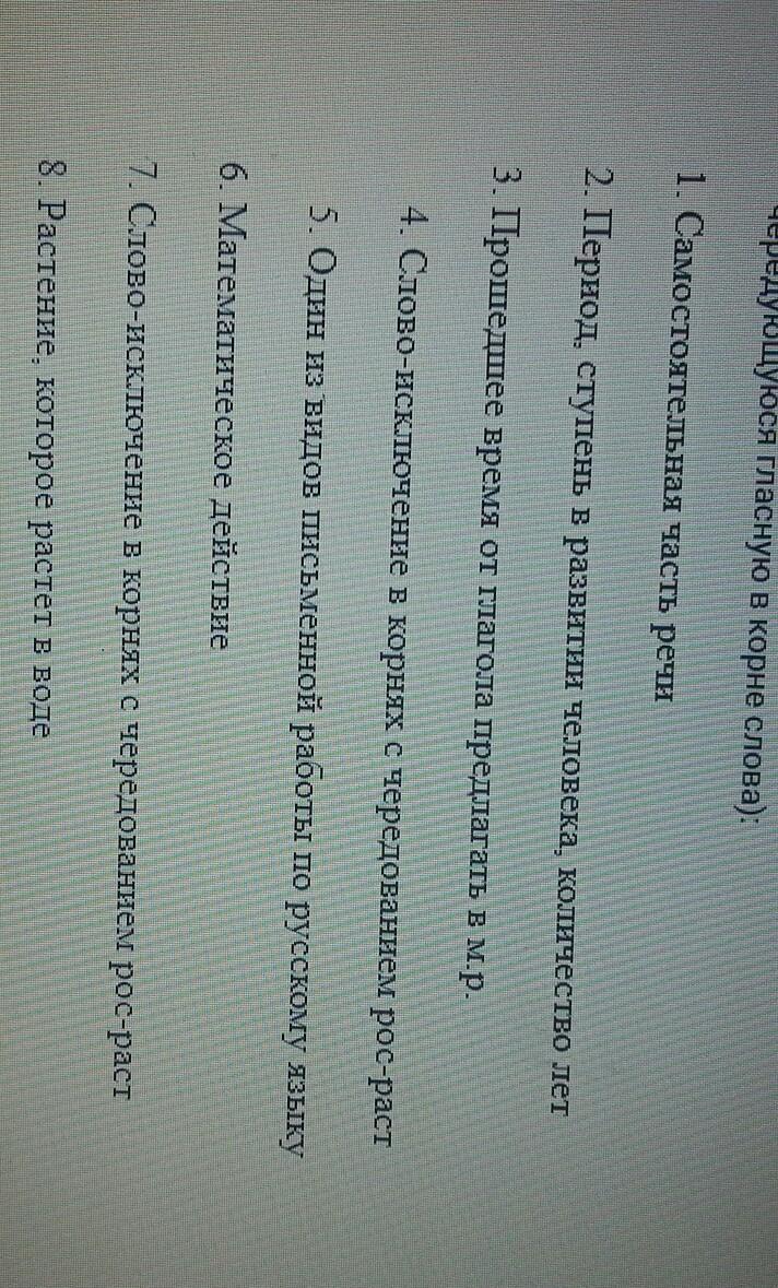 задания:письменно ответьте одним словом(слово - ответ должно содержать чередующуюся гасную в корне слова):