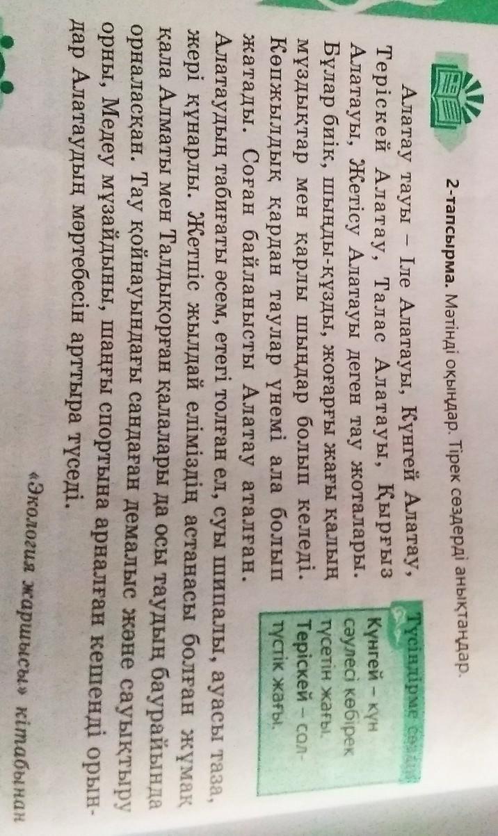 2 - топ:биік, шыңды, құзды, жоғарғы, қалың, ала, көпжылдық, қарлы, шипалы, таза, құнарлы, әсем, жұмақ қала, шаңғы спорты, кешенді.