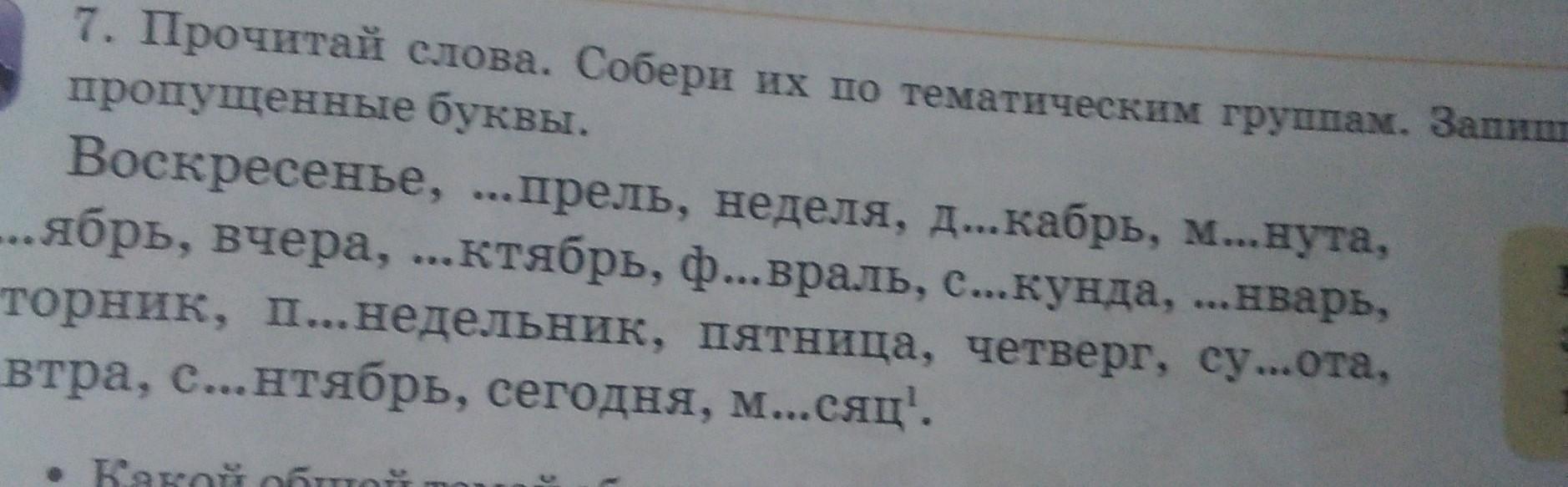 7. Прочитай слова. Собери их по тематическим группам. Запиши, вставляя