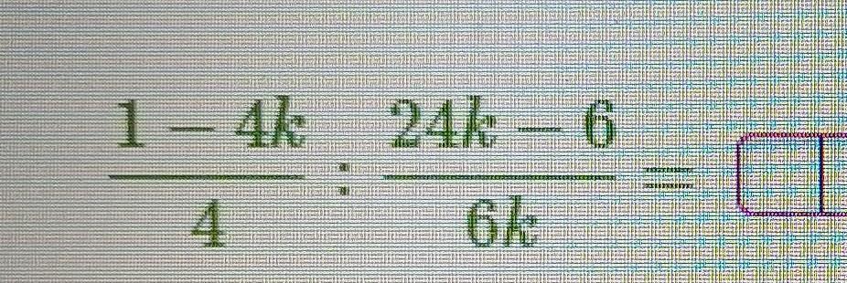 \frac{1 - 4k}{4}  \times  \frac{6k}{24k - 6}  =  \frac{1 - 4k}{4}  \times  \frac{6k}{ - 6( - 4k + 1)}  =  - \frac{ -4k + 1}{ 4}  \times  \frac{6k}{ - 6( - 4k + 1)}  =   - \frac {1}{2} \times  \frac{3k}{ - 6}  =  -  \frac{3k}{ - 12}  =  -  \frac{k}{4}