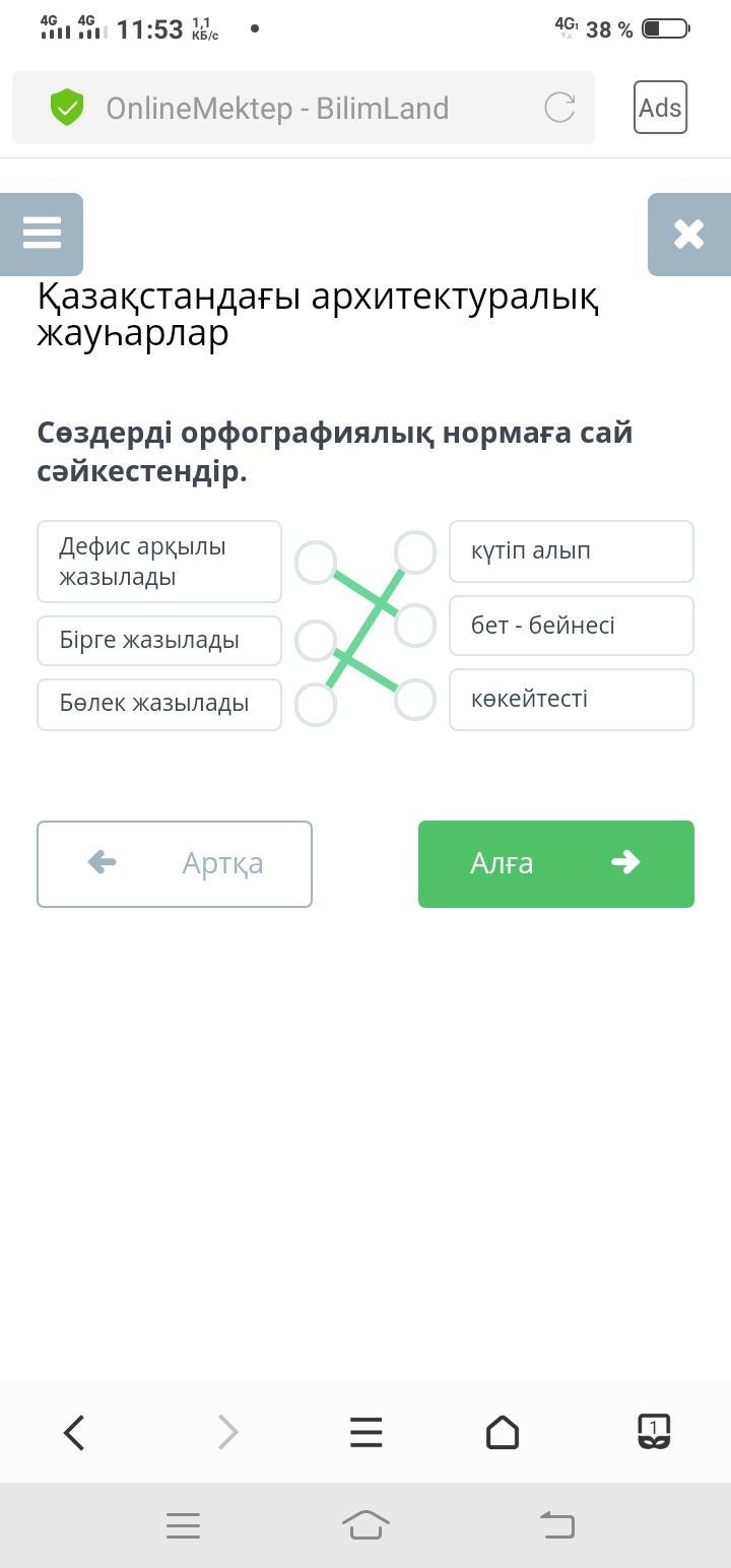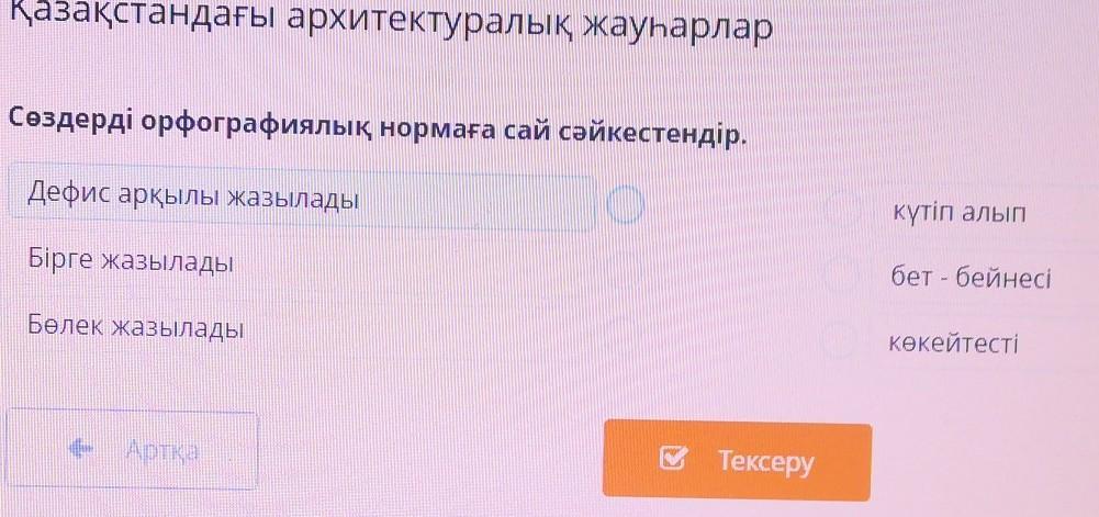 Сөздерді орфографиялық нормаға сай сәйкестендір.
