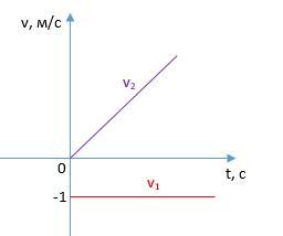1) Сравнивая с данными уравнениями, видим, что первое тело движется равномерно (ускорение равно 0), а второе - равноускоренно.