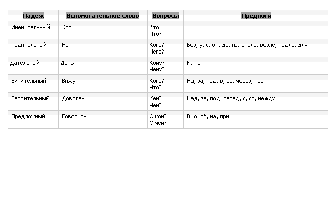 Изменение имён существительных по падежам называется склонением. В русском языке шесть падежей: именительный, родительный, дательный, винительный, творительный, предложный.