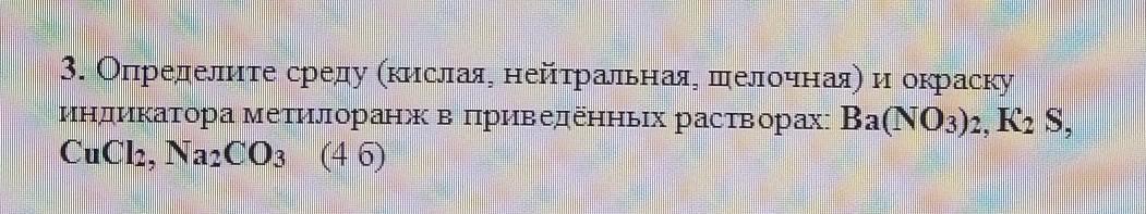 индикатора метилоранж в приведённых растворах Ba(NO3)2, K: S,