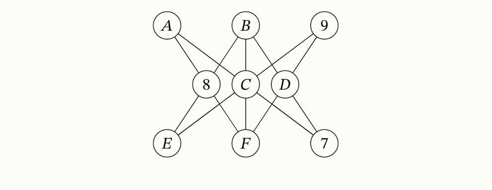 4-4 Расставьте цифры от 11 до 66 (каждую нужно использовать ровно один раз) так, чтобы сумма трёх чисел, расположенных на каждой из 77 прямых, была равна 1515. В ответе укажите, какие цифры должны стоять на местах AA — FF.
