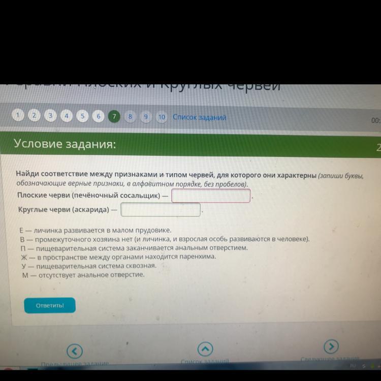 Ответ: печеночный сосальщик - Е, Ж, М. аскарида - В, П, У.