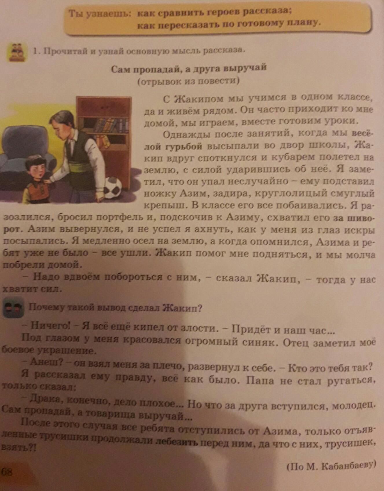 3. Азим -задира, обижает слабых, поэтому его побаивается весь класс. Анеш - заступается за друга, ему не нравится, что обижают его друзей.