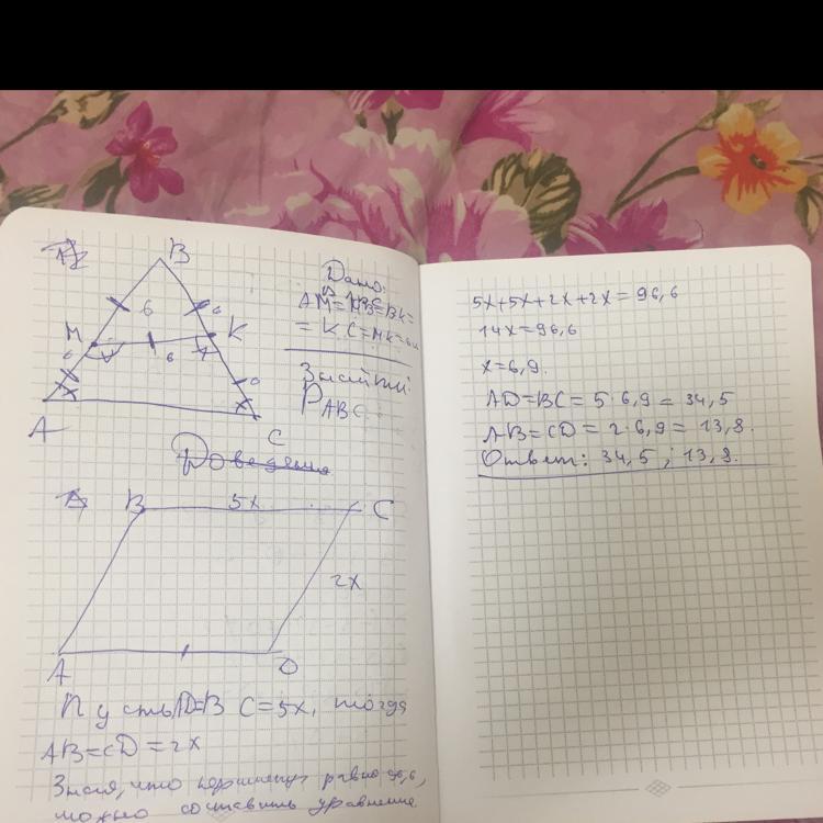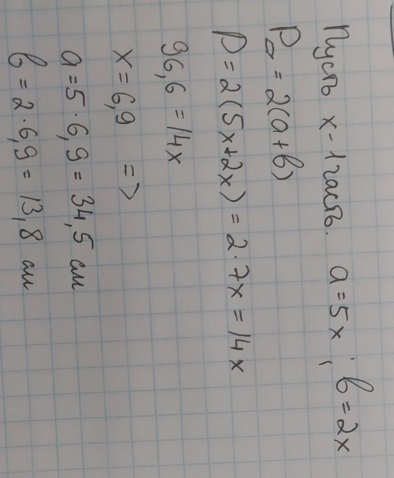 Стороны параллелограмма соотносятся как 5:2, а периметр равен 96,6 см. Вычисли стороны параллелограмма.