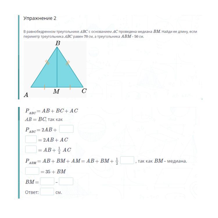 в равнобедренном треугольнике abs с основанием AC проведена медиана bm найдите её длину если периметр треугольника . abs равен 70см а треугольника ABM 50 см