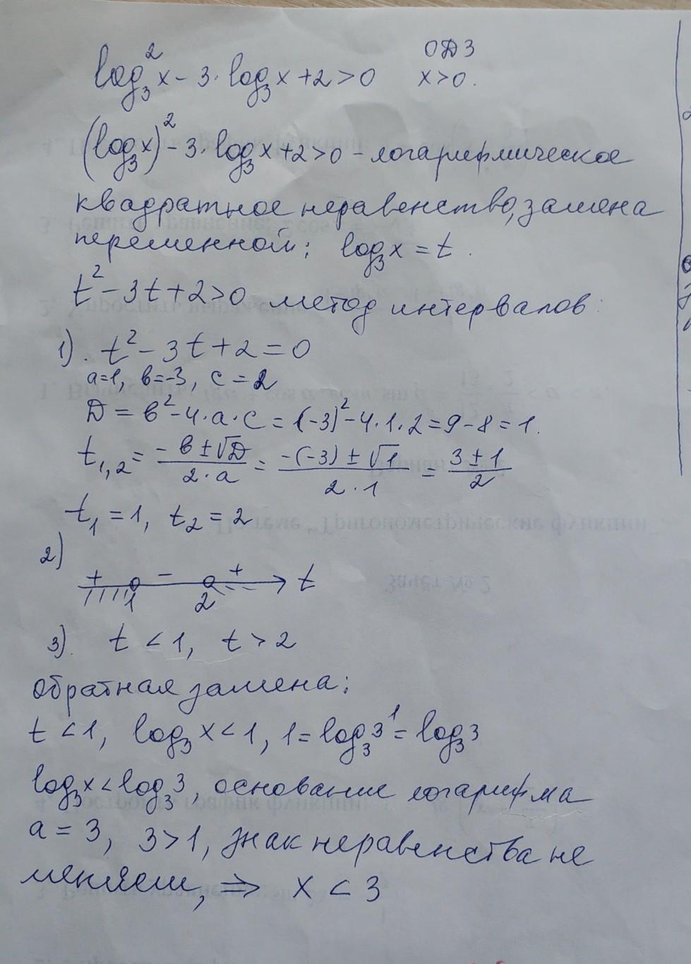 (Логарифм в степени 2 числа Х по основанию 3 минус 3 умноженное на логарифм числа Х по основанию 3 плюс 2 больше нуля)