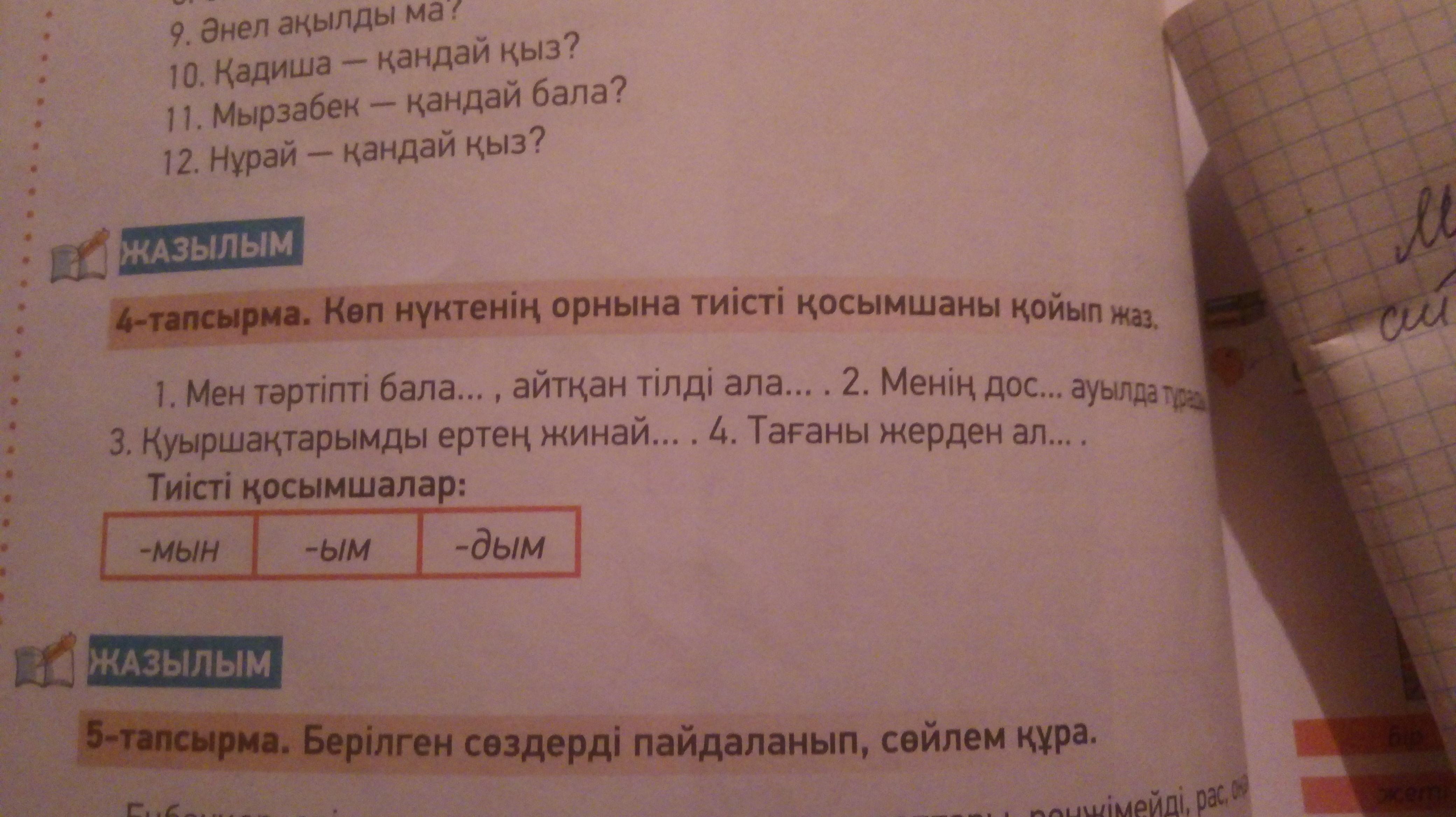 Мен тәртіпті баламын,айтқан тілді аламын.Менің досым ауылда тұрады.Қуыршақтарымды ертең жинаймын. Талғаны жерден алдым.