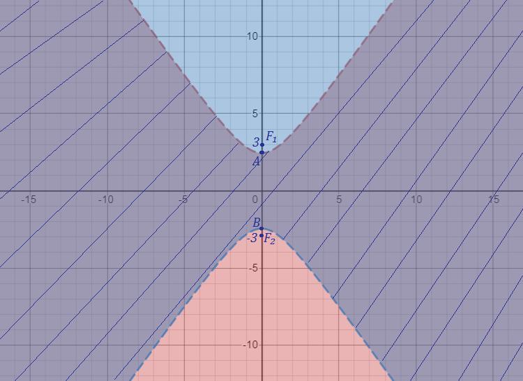 Областью определения функции будет часть плоскости, лежащая между ветвями гиперболы, причём граница области, то есть сама гипербола , в ООФ не входит . На рисунке область заштрихована .