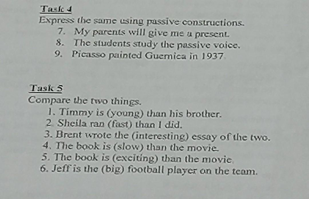 Ответ: Task 4 : 7) A present was given me by my parents 8) Passive voice is studied by the students 9) Guemica was painted by Picasso in 1937