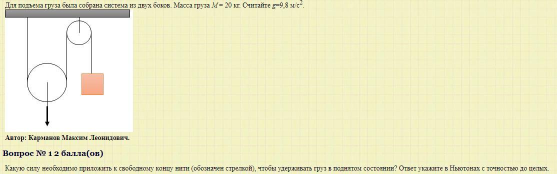 Для подъема груза была собрана система из двух боков. Масса груза M = 20 кг. Считайте g=9,8 м/с2. Какую силу необходимо приложить к свободному концу нити (обозначен стрелкой), чтобы удерживать груз в поднятом состоянии?