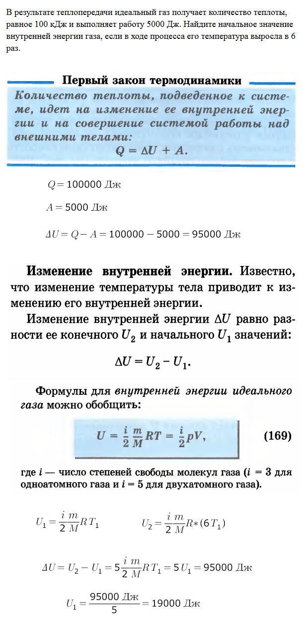 В результате теплопередачи идеальный газ получает количество теплоты, равное 100 кДж и выполняет работу 5000 Дж. Найдите начальное значение внутренней энергии газа, если в ходе процесса его температура выросла в 6 раз.