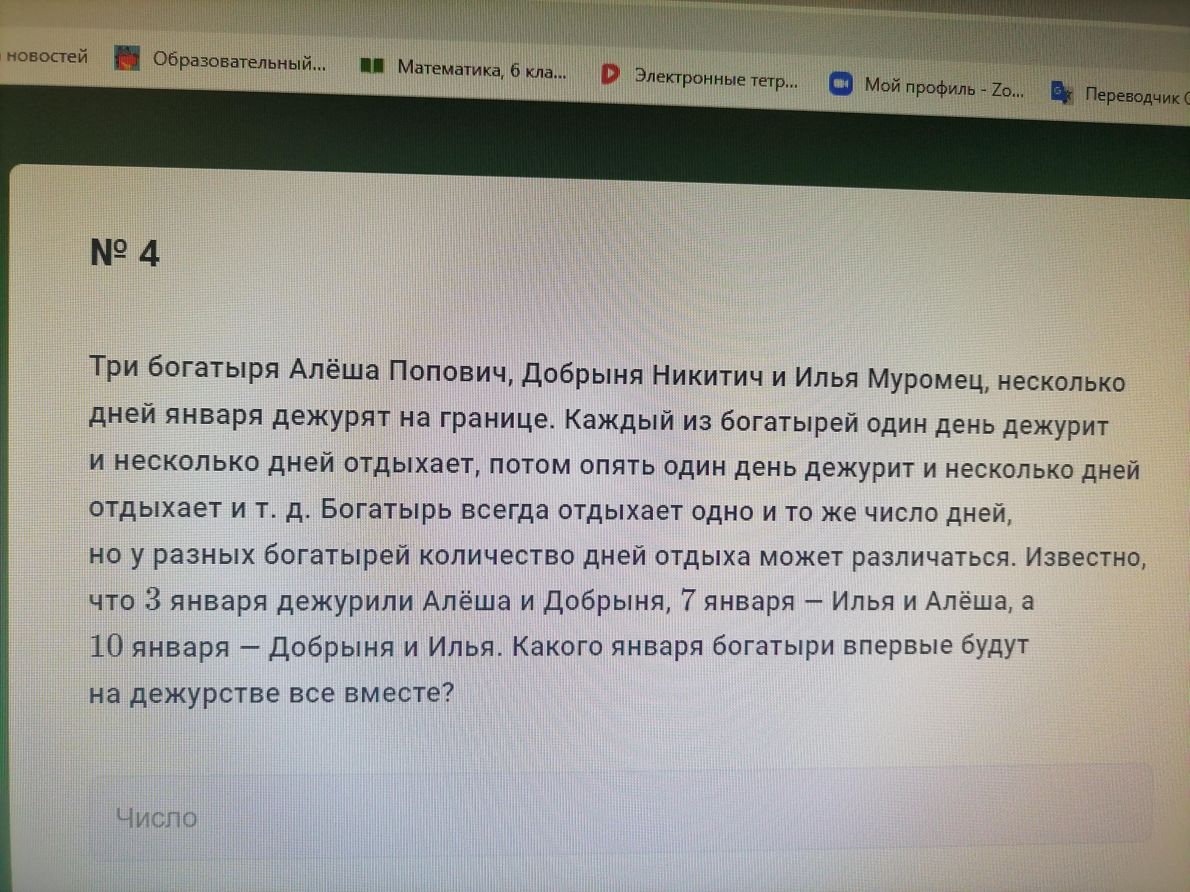 Сложим все дни, когда дежурили богатыри = 3 января+7 января+10 января = 20 января
