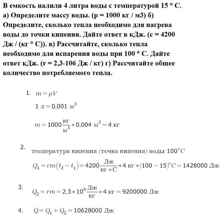 В емкость налили 4 литра воды с температурой 15 ° C. а) Определите массу воды. (p = 1000 кг / м3) б) Определите, сколько тепла необходимо для нагрева воды до точки кипения. Дайте ответ в кДж. (c = 4200 Дж / (кг ° C)). в) Рассчитайте, сколько тепла необходимо для испарения воды при 100 ° C. Дайте ответ кДж. (r = 2,3-106 Дж / кг) г) Рассчитайте общее количество потребляемого тепла.