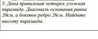 Основание квадрат. Диагональ делим пополам. 20:2=10. А теперь теорема Пифагора. Ребро -гипотенуза; первый катет половина диагонали; высота - второй катет.