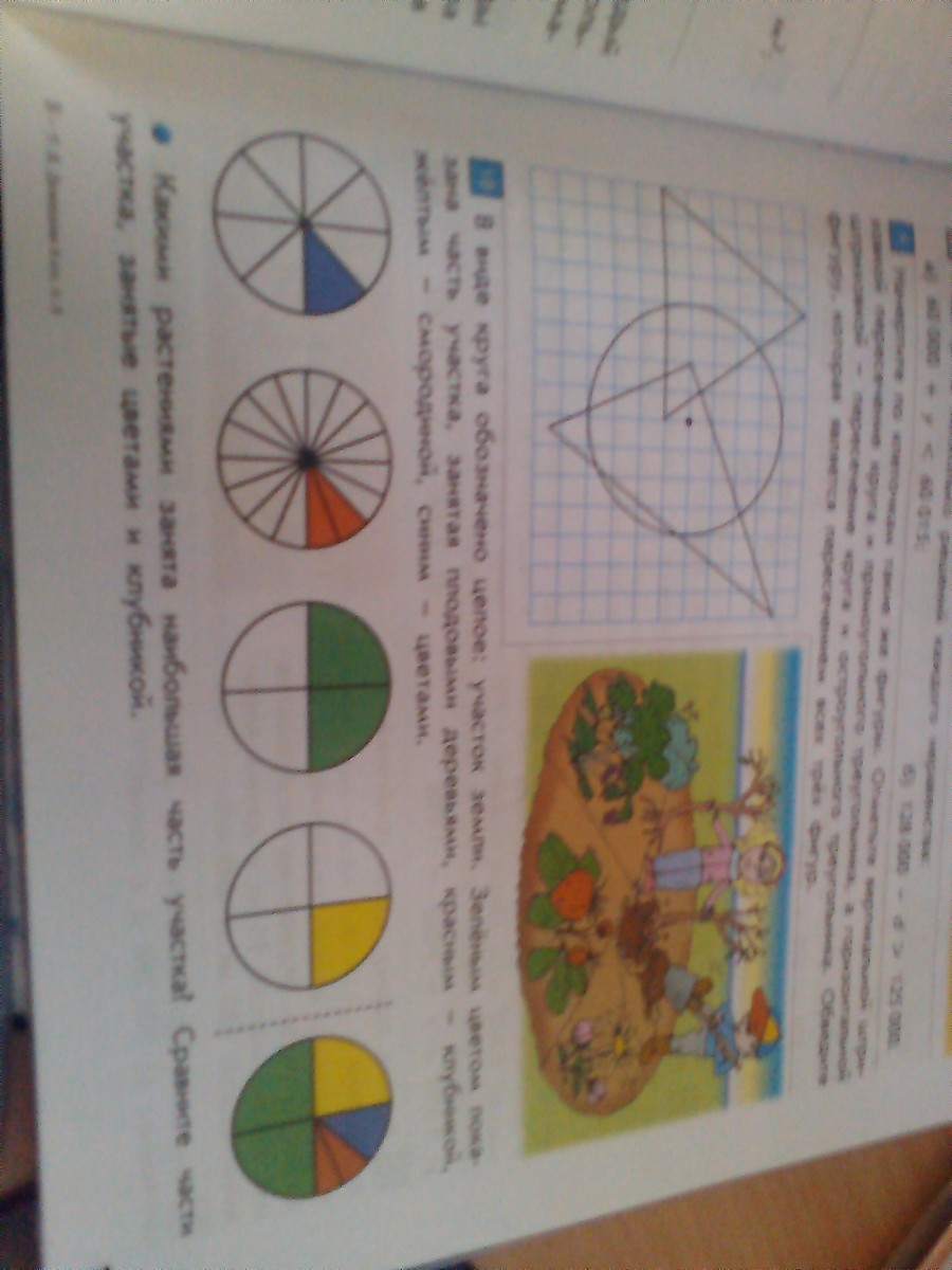 в видекруга обозначено целое участок земли зеленым цветом показана часть участка занятая плодовыми деревьями красным клубникой, желтым смородина, синим цветами. какими растениями занята наибольшое частьучастка сравните части участка, занятые цветами и клубникой.