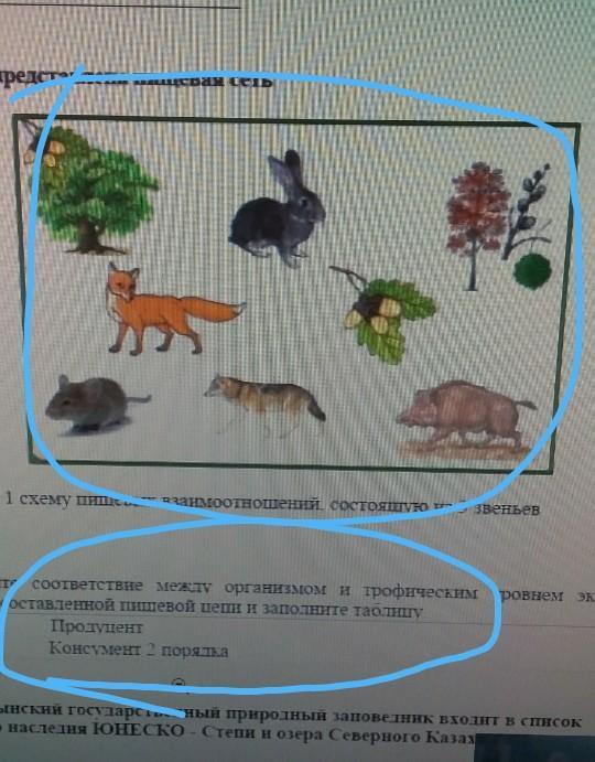 В) Установите соответствие между организмом и трофическим уровнем экологической пирамиды,составленной пищевой цени и заполните таблицу.