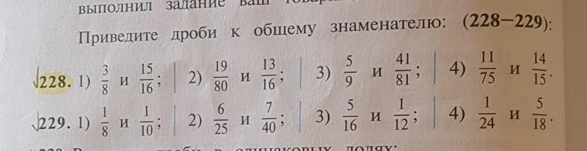 228. 1)3/8 и 15/16 2)19/80 и 13/16 3)5/9 и 41/81 4)11/75 и 14/15