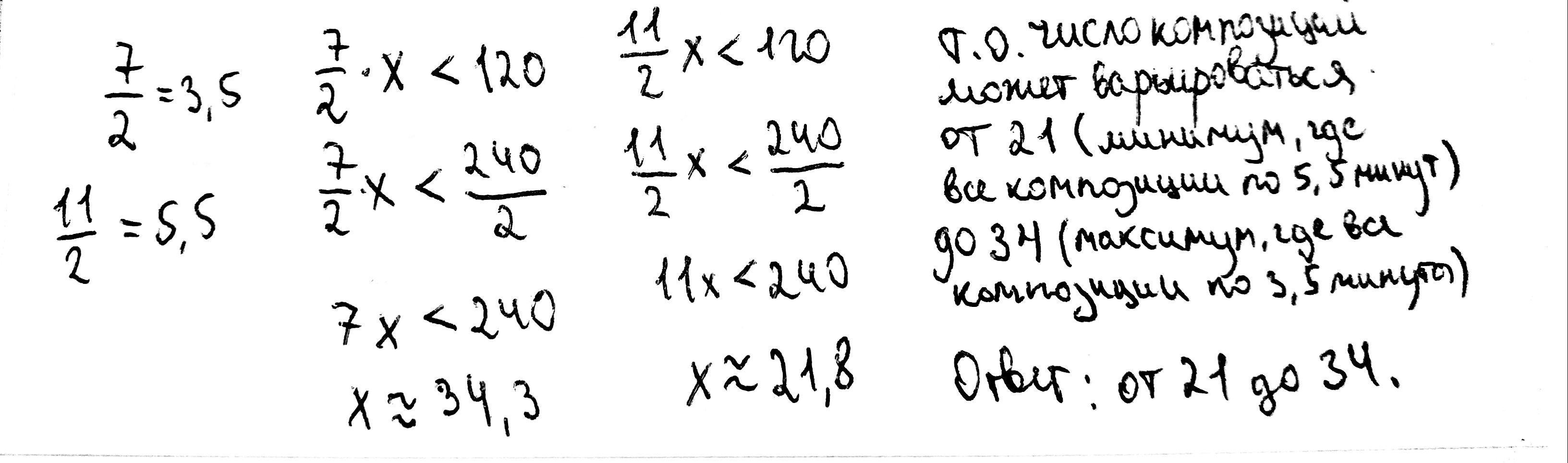 Сеня хочет составить плейлист продолжительностью 2 часа. Оцените количество композиций в нём, если каждая композиция имеет продолжительность от 3,5 до 5,5 минут.