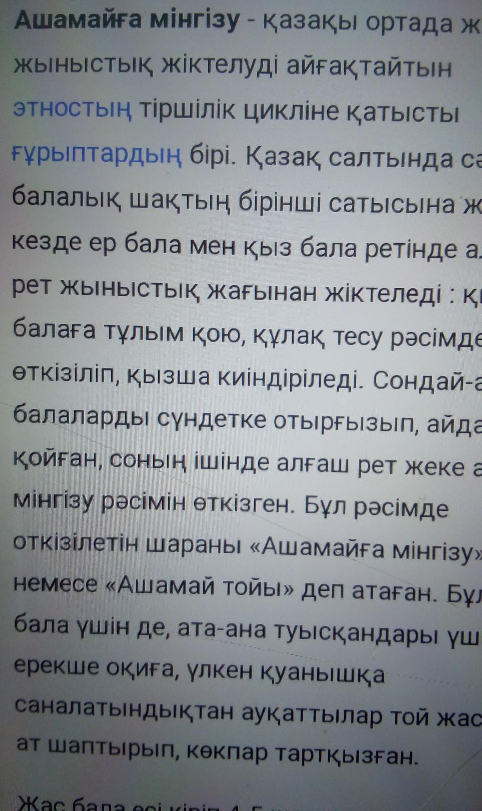 “Ашамайға мінгізу”салтын өткізуді мәтіндегі ақпаратқа сүйене отырып жаз. Комектесіңдерші бірмізғой!