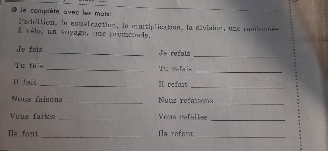 5. Vous faites une randonnée à vélo. Vous refaites une randonnée à vélo.