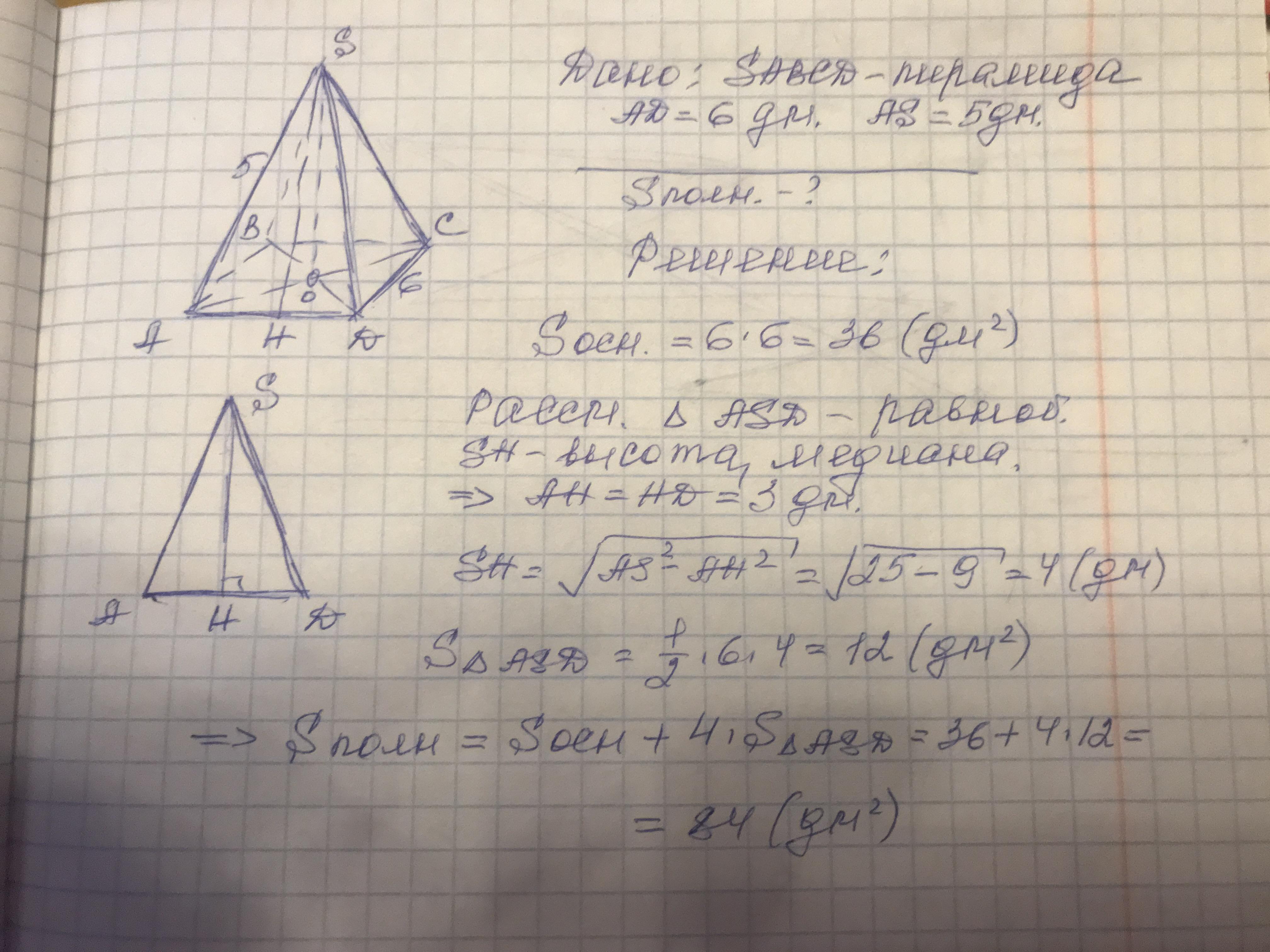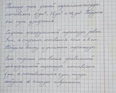 Прошу прощение, в последней задаче есть ошибка. Исправленное: Если сторона основания прямоугольной пирамиды составляет 6 дм, а составляющая 5дм, тогда найдите её полную поверхность.