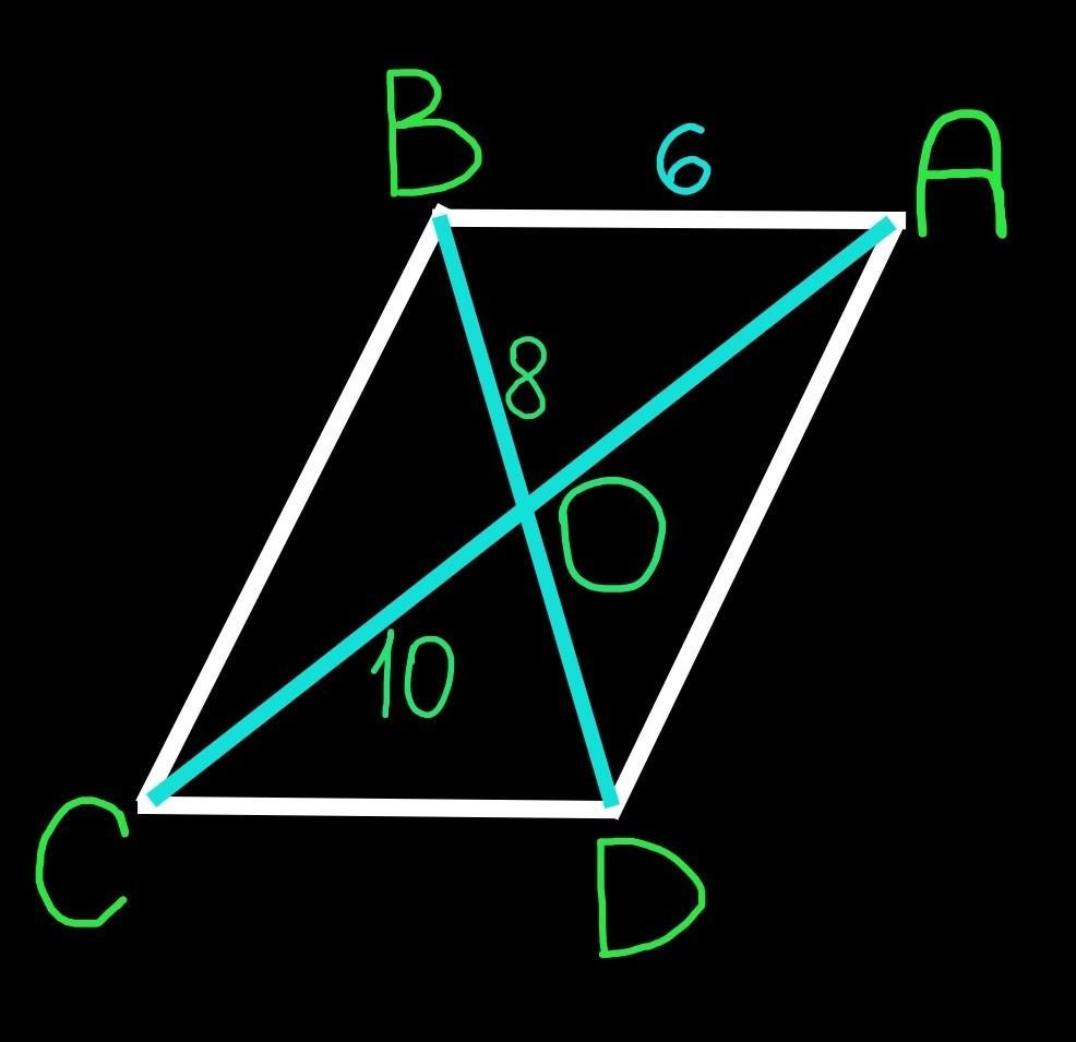 Следовательно: OD=BO=BD÷2=8÷2=4 см; СО=ОА=AC÷2=10÷2=5 см