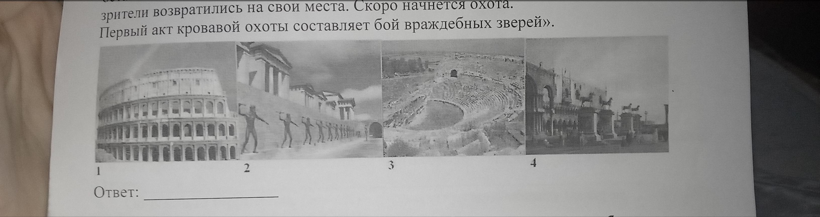 Задание 4. По описанию определите, в каком сооружении Древнего мира происходило событие, о котором идет речь в отрывке. Соотнесите описание с приведенными изображениями сооружений. Выберите иллюстрацию с изображением этого сооружения, укажите соответствующий номер. «Великие игры … давались на счет государства или назначенными для того высшими сановниками на собственный счет, но сами наездники или возницы, правившие колесницами …, были или рабы, или вольноотпущенники и чужестранцы, которые приезжали в тот город, где давались игры… Уже ночью втеснялись беднейшие дабы занять лучшие нижние места и уступить их потом за известную плату тем, которые опаздывали. В промежуток времени, когда игры в полдень прекращались, зрители обыкновенно оставляли … чтобы позавтракать в съестных лавках… Но вот столы приняты, и зрители возвратились на свои места. Скоро начнется охота. Первый акт кровавой охоты составляет бой враждебных зверей».
