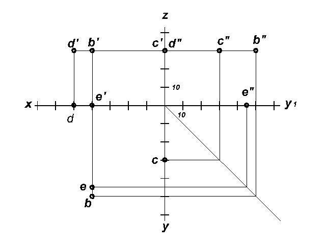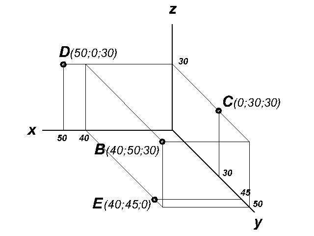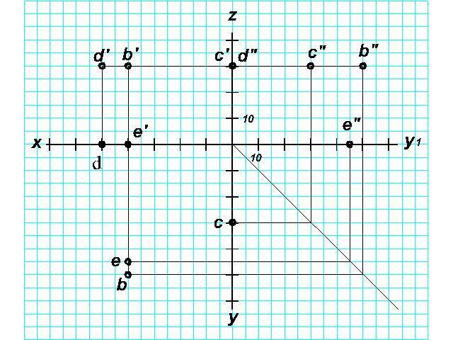 Построить наглядное изображение и Эпюры точек ABCD, определить принадлежит ли каждая из этих точек какой либо проекции. Точки: В (x-40,y-50,z-30). C (x-0,y-30,z-30). D (x-50,y-0,z-30). E (x-40,y-45,z-0) Помогите пожалуйста, последняя надежда (