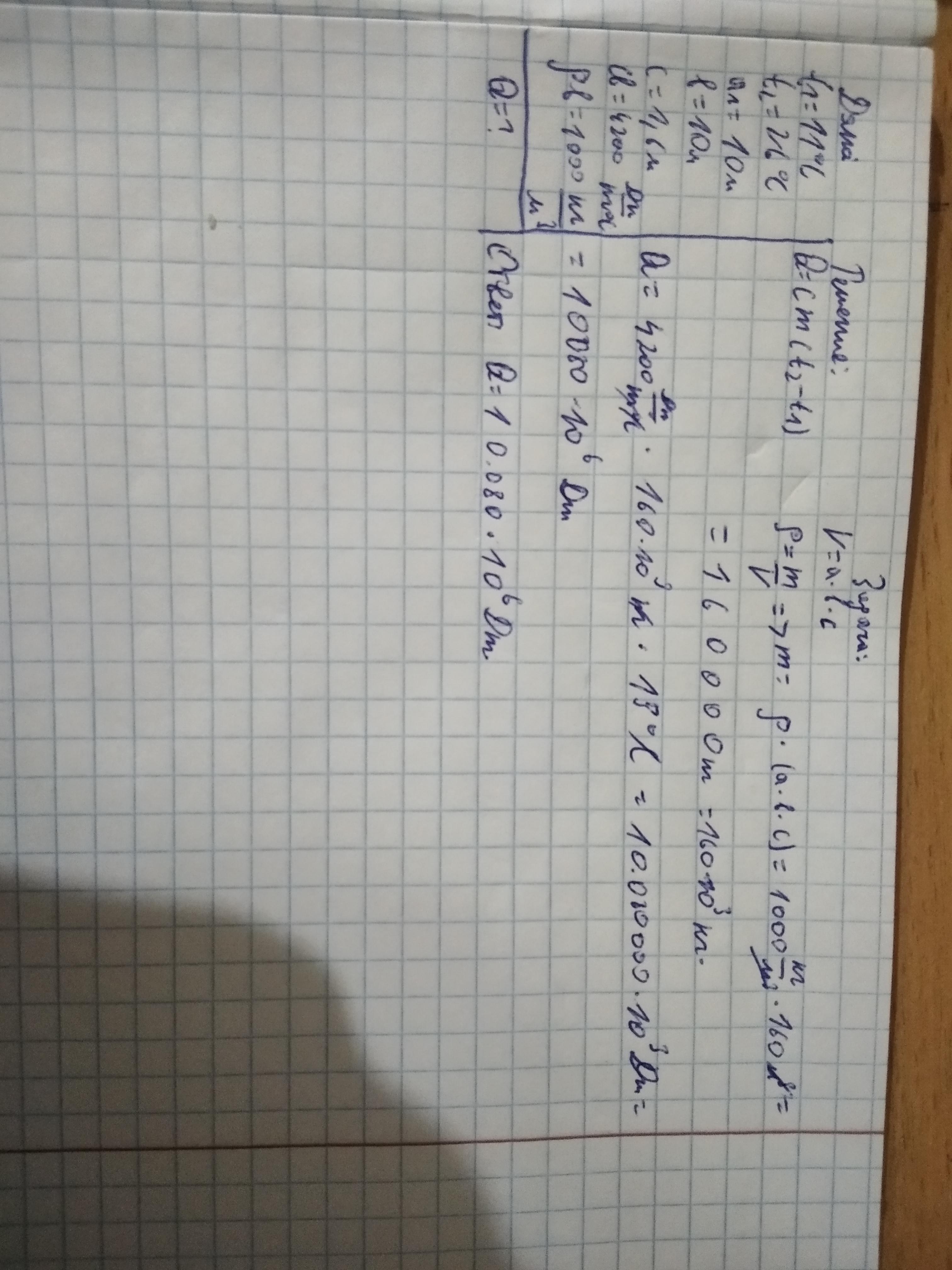 Определи, какое количество теплоты пойдёт на нагревание воды от 11°C до 26°C в бассейне, длина которого — 10 м, ширина — 10 м и глубина — 1,6 м. Удельная теплоёмкость воды равна 4200 Дж/(кг·°C), плотность воды — 1000 кг/м³.
