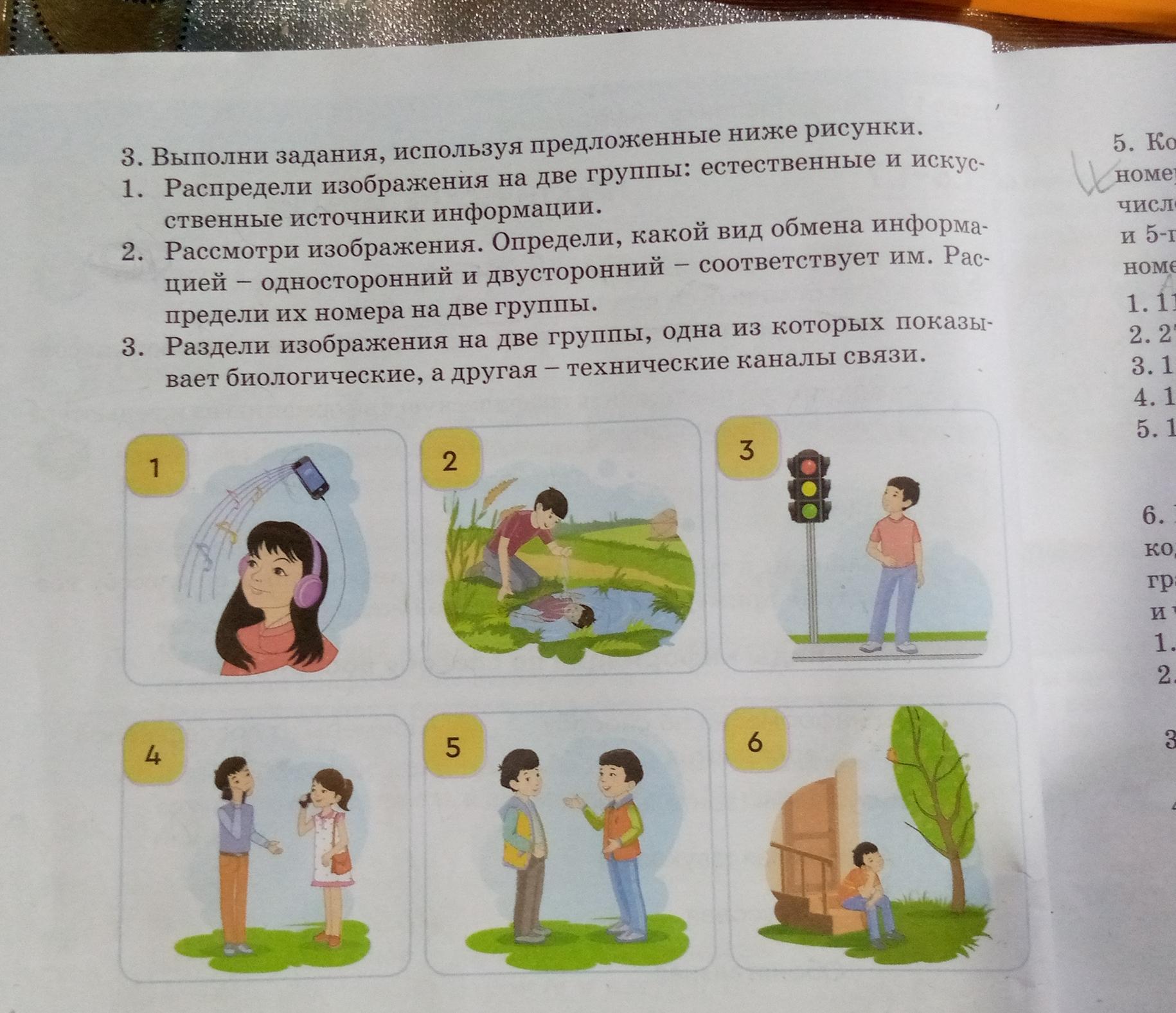 Рассмотри изображение . Определи какой вид обмена информацией - односторонний и двусторонний - соответствует им . Распредели их номера на две группы