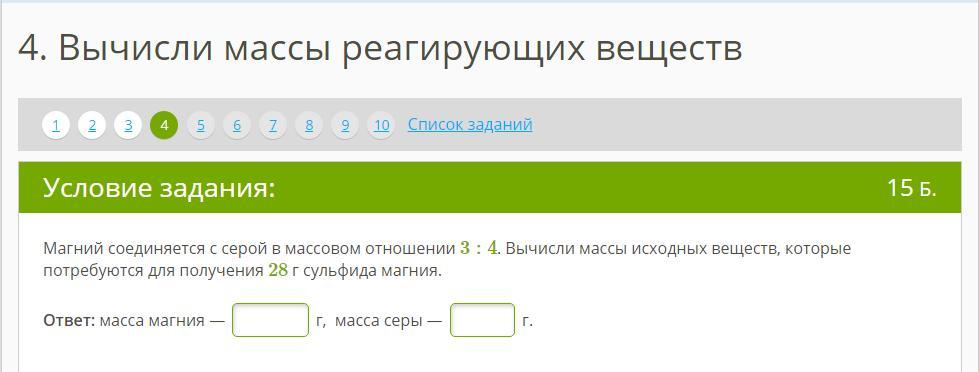 Магний соединяется с серой в массовом отношении 3:4. Вычисли массы исходных веществ, которые потребуются для получения 28 г сульфида магния.