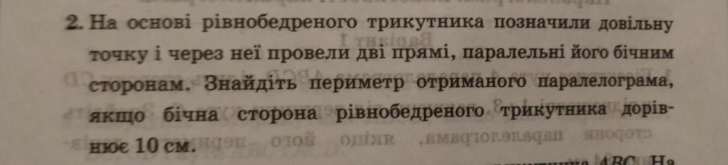 Думаю, что ответ 10. Т.к. проведенные параллельные линии будут делить сторону треугольника пополам. т.к. боковая сторона треугольника равна 10см. Тогда половина стороны 5см. У полученного паралелограма стороны одинаковые. т.е есго периметр будет равен 5*4=20см