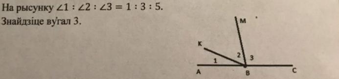 На ресунке угол1 : угол2 : угол3 = 1 : 3 : 5 . Найдите угол 3