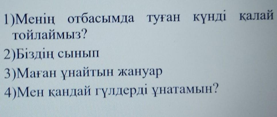 1)Менің отбасымда туған күнді керемет тойлаймыз.Барлығымыз жиналып дастархан жайсаймыз. Бәрінің көңілі көтеріліп қалады.Біз өзіміздің жылы тілектерімізді айтамыз.Жалпы менің отбасымда туған күн көңілді өтеді.