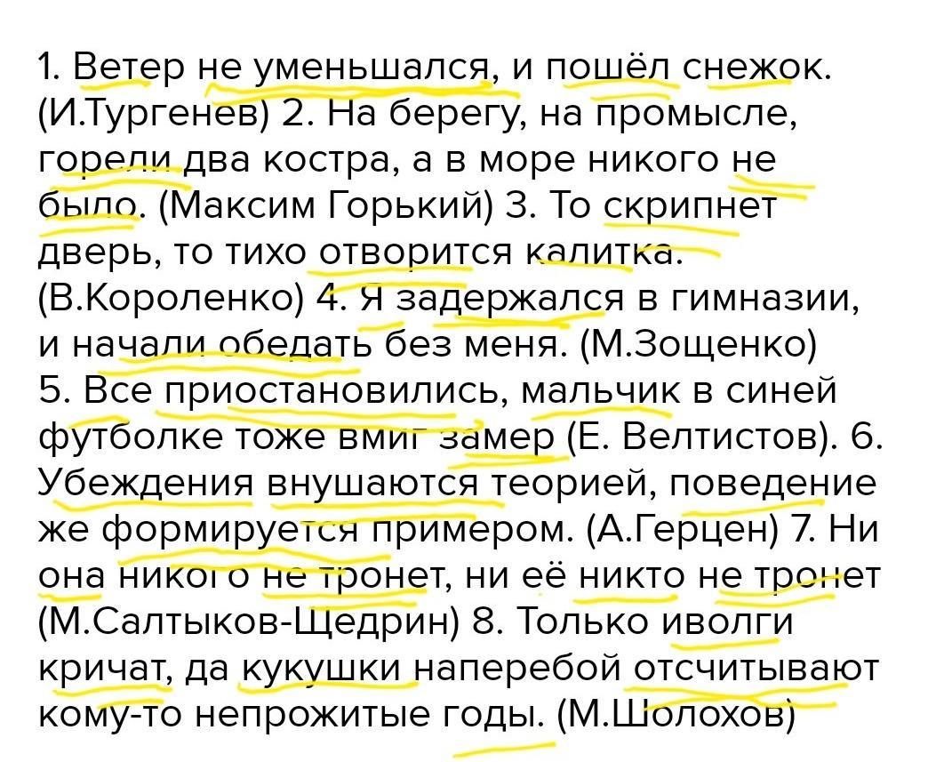 1. Ветер не уменьшался, и пошёл снежок. (И.Тургенев) 2. На берегу, на промысле, горели два костра, а в море никого не было. (Максим Горький) 3. То скрипнет дверь, то тихо отворится калитка. (В.Короленко) 4. Я задержался в гимназии, и начали обедать без меня. (М.Зощенко) 5. Все приостановились, мальчик в синей футболке тоже вмиг замер (Е. Велтистов). 6. Убеждения внушаются теорией, поведение же формируется примером. (А.Герцен) 7. Ни она никого не тронет, ни её никто не тронет (М.Салтыков-Щедрин) 8. Только иволги кричат, да кукушки наперебой отсчитывают кому-то непрожитые годы. (М.Шолохов)
