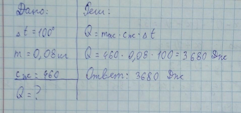 Какое количество теплоты необходимо для нагревания железного кубика массой 80 г на 100 ºС?