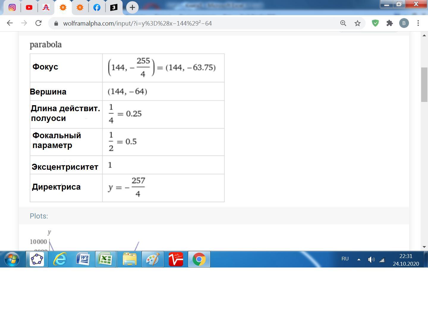 Её ось сдвинута вправо по оси Ох на 144 единицы, а вершина опущена вниз на 64 единицы.