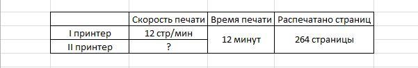 На двух принтерах , работающих одновременно, распечатали 264 страницы рукописи за 12 мин.Cкорость печати одного принтера 12 страниц в минуту.Какова скорость печати одного принтера?