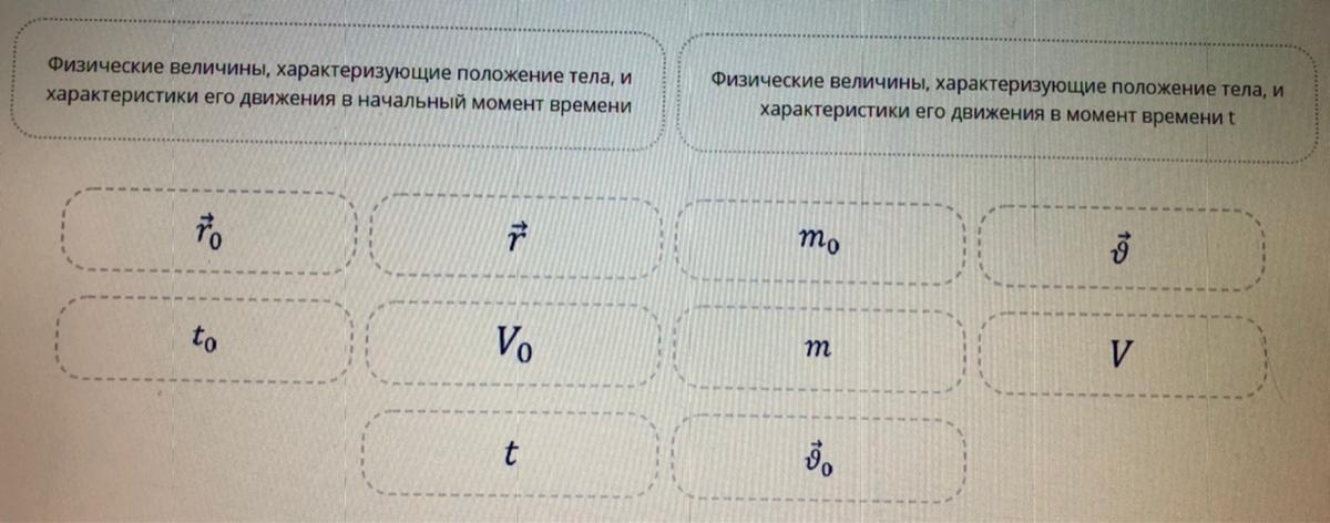 Перенесите физические величины характеризующие положение тела и характеристики его движения в начальный момент времени в левую фигуру, а в момент времени t - в правую фигуру