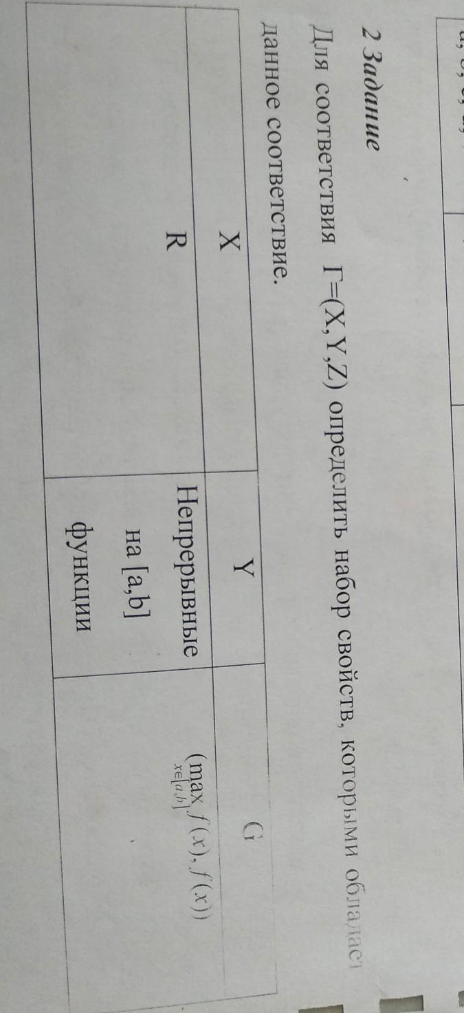 Для соответствия Г=(X, Y, G) определить набор свойств, которыми обладает данное соответствие: X = R, Y - функции, непрерывные на [0, 1], G = (m, f(x)|minf(x) = m). То есть соответствие состоит из пар (число, функция), причём пара есть не для любого числа и функции, а только если это число является минимумом функции.