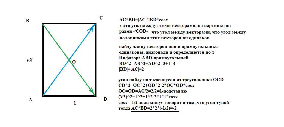 В прямоугольнике ABCD AB=√3, BC=1. Найдите скалярное произведение векторов AC и BD.