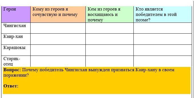 3. КАрашокы – предатель, открывший ворота врагу. Он лишен чувства патриотизма к своей родине. Он тоже не заслуживает ни сочувствия, ни восхищения. Даже Чингисхан отдает его обратно Каирхану.