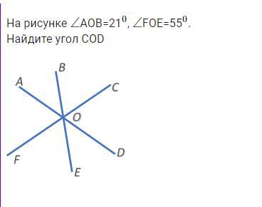 2) АОВ = 21°, FOE = BOC (вертикальные углы равны), АОД развернутый угол ( равен 180°). Чтобы найти СОД нужно 180° - (угол АОВ + угол ВОС) =104°