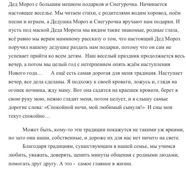 1) Благодаря традициям, /существующим в нашей семье/, мы учимся любить, уважать, доверять, ценить минуты общения с родными людьми, помогать друг другу.
